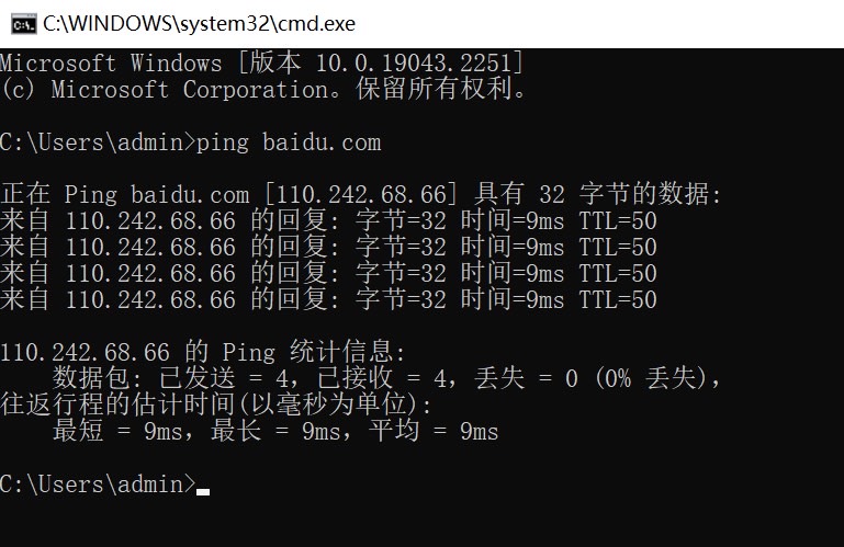 Win+R运行CMD,输入ping baidu.com,回车: