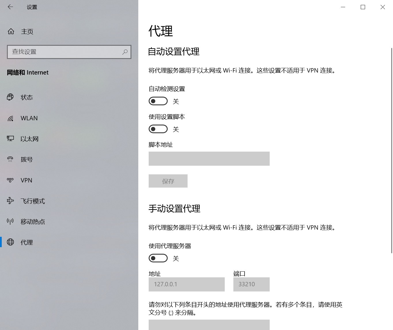 打开设置,在网络和Internet中,检查代理是否全关,如图: