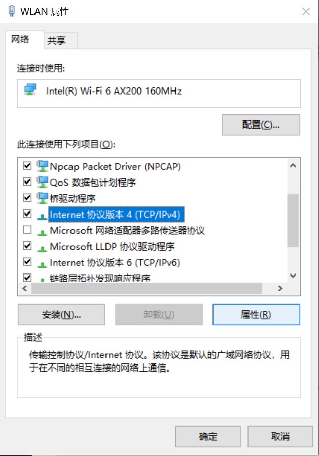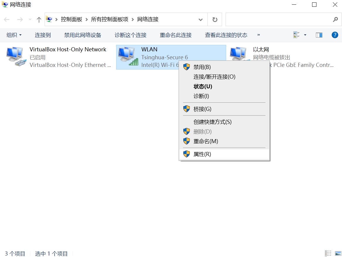 在上面第1步弹出的窗口中,右键点击用于网络连接的设备(此处为WLAN),选择属性: